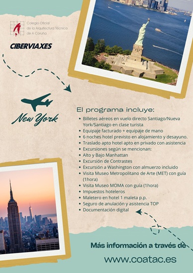 Ciberviaxes organiza unha viaxe a New York con voos directos desde Santiago con vantaxes para as nosas colexiados grazas ao convenio que temos asinado.