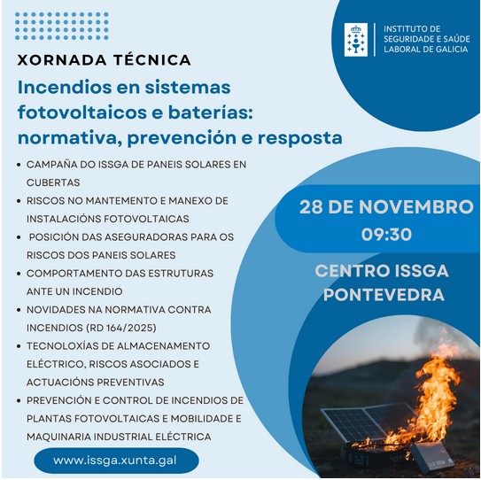 El ISSGA organiza la jornada técnica "Incendios en Sistemas Fotovoltaicos y Baterías: Normativa, Prevención y Respuesta", que se celebrará en el Centro del ISSGA de Pontevedra, el 28 de noviembre de 2025 a las 9:30 horas.
