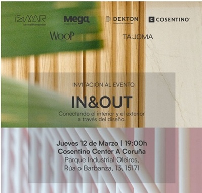 Cosentino Center A Coruña, te invita a asistir al evento IN&OUT "Conectando el interior y el exterior a través del diseño, que se celebrará el jueves día 12 de marzo a las 19:00 horas en el Parque Industrial de Oleiros (Rúa o Barbanza, 13).