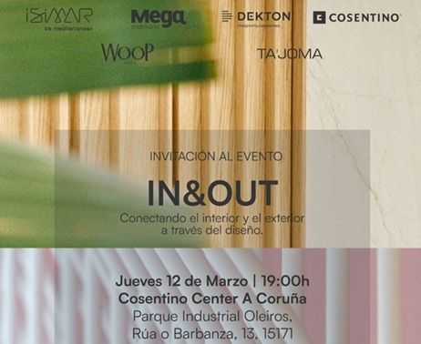 CONSENTINO te invita al evento IN&OUT Conectando el interior y el exterior a tarvés del diseño, que se celebrará el jueves día 12/03/2026 a las 19:00 horas en el Parque Industrial de Oleiros (Rúa O Barbanza, 13 - 15171 - Oleiros (A Coruña)).